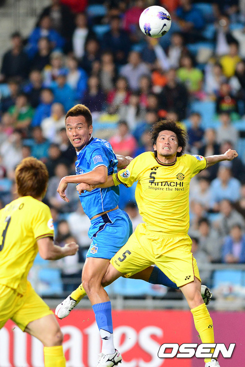 30일 오후 울산 문수축구경기장에서 열린 '2012 아시아축구연맹 챔피언스리그(ACL)' 16강전 울산 현대와 가시와 레이솔의 경기 전반 김신욱이 문전에서 헤딩을 시도하고 있다.