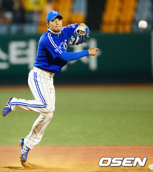 30일 오후 대전 한밭야구장에서 열린 한화 이글스와 삼성 라이온즈의 경기에서 6회말 2사 주자 없는 상황에서 한화 강동우의 땅볼 타구를 삼성 유격수 김상수가 잡아 1루로 송구하고 있다.