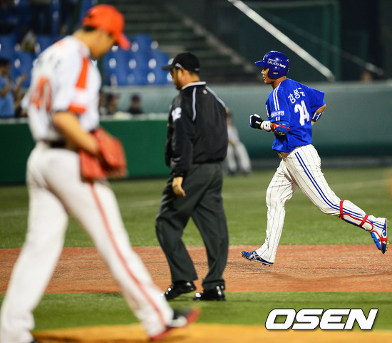 30일 오후 대전 한밭야구장에서 열린 한화 이글스와 삼성 라이온즈의 경기에서 7회초 2사 주자 없는 상황에서 삼성 강봉규가 선취 중월 솔로 홈런을 날린 후 그라운드를 돌고 있다.