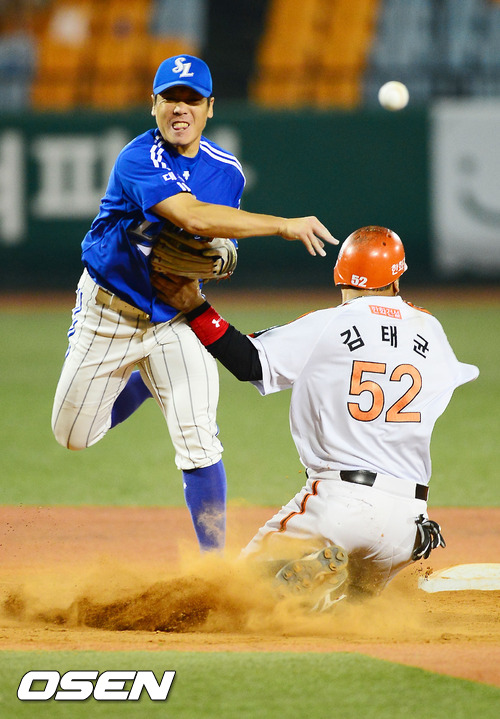 30일 오후 대전 한밭야구장에서 열린 한화 이글스와 삼성 라이온즈의 경기에서 7회말 1사 주자 1,3루 한화 최진행의 유격수 앞 병살타때 삼성 2루수 조동찬이 2루에서 김태균을 포스아웃 시킨후 돌진하는 김태균을 피하며 1루로 송구하고 있다.