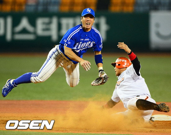 30일 오후 대전 한밭야구장에서 열린 한화 이글스와 삼성 라이온즈의 경기에서 7회말 1사 주자 1,3루 한화 최진행의 유격수 앞 병살타때 삼성 2루수 조동찬이 2루에서 김태균을 포스아웃 시킨후 돌진하는 김태균을 피하며 1루로 송구하고 있다.