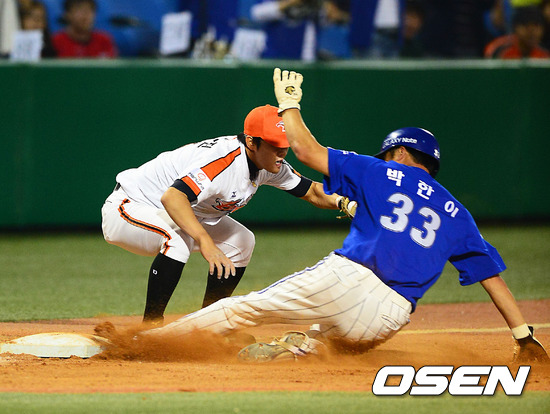 30일 오후 대전 한밭야구장에서 열린 한화 이글스와 삼성 라이온즈의 경기에서 8회초 2사 주자 1,3루 삼성 박석민이 좌익수 앞 1타점 적시타때 1루 주자 박한이가 3루에 세이프되고 있다.