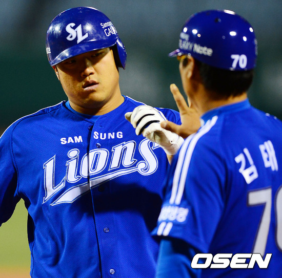 30일 오후 대전 한밭야구장에서 열린 한화 이글스와 삼성 라이온즈의 경기에서 8회초 2사 주자 1,3루 삼성 박석민이 좌익수 앞 1타점 적시타를 날린 후 1루에서 김태균 코치와 하이파이브를 하고 있다.