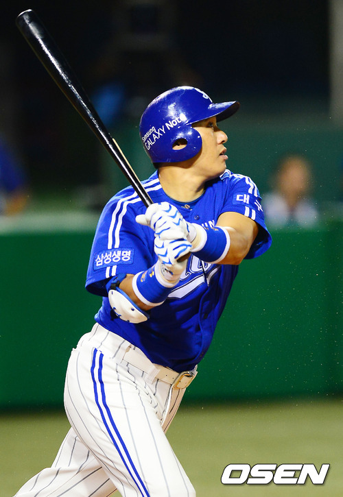 30일 오후 대전 한밭야구장에서 열린 한화 이글스와 삼성 라이온즈의 경기에서 8회초 2사 주자 1,3루 삼성 이승엽이 중견수 오른쪽 1타점 적시타를 날리고 있다.