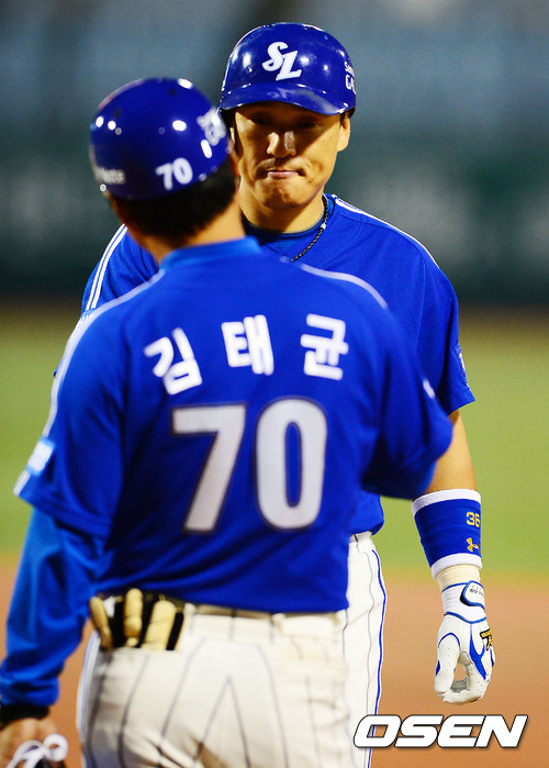 30일 오후 대전 한밭야구장에서 열린 한화 이글스와 삼성 라이온즈의 경기에서 8회초 2사 주자 1,3루 삼성 이승엽이 중견수 오른쪽 1타점 적시타를 날린 후 1루에서 김태균 코치와 하이파이브를 하고 있다.