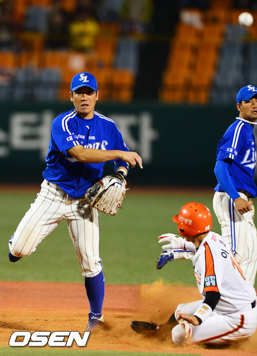 30일 오후 대전 한밭야구장에서 열린 한화 이글스와 삼성 라이온즈의 경기에서 8회말 무사 주자 1루 한화 오선진의 유격수 앞 병살타때 삼성 2루수 조동찬이 2루에서 이대수를 포스아웃 시킨 후 1루로 송구하고 있다.