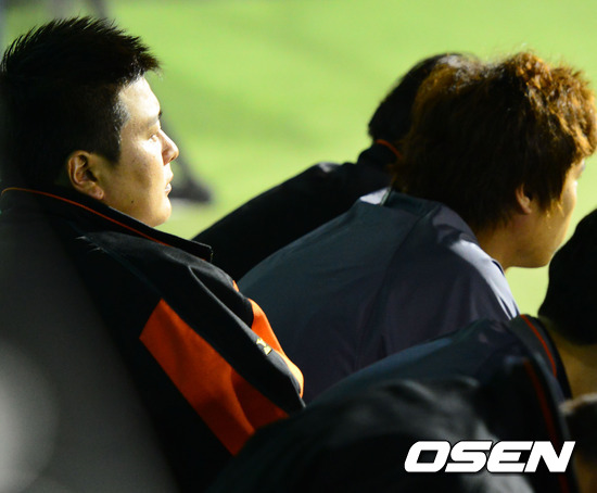 30일 오후 대전 한밭야구장에서 열린 한화 이글스와 삼성 라이온즈의 경기에서 8회초 덕아웃 앞에서 김태균이 아쉬운표정으로 류현진, 박찬호와 함께 경기를 지켜보고 있다.