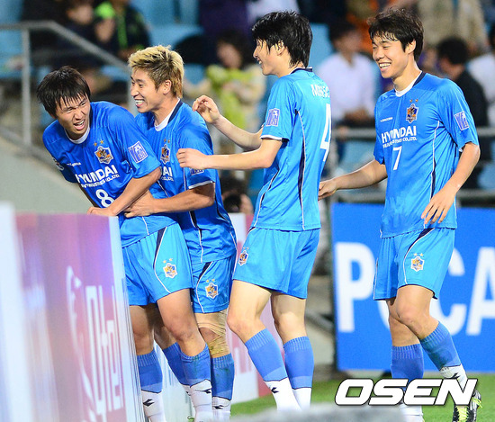 30일 오후 울산 문수축구경기장에서 열린 '2012 아시아축구연맹 챔피언스리그(ACL)' 16강전 울산 현대와 가시와 레이솔의 경기 후반 이호의 크로스가 가시와 수비의 자책골로 이어지면서 2-1이 되자 울산 선수들이 기뻐하고 있다.