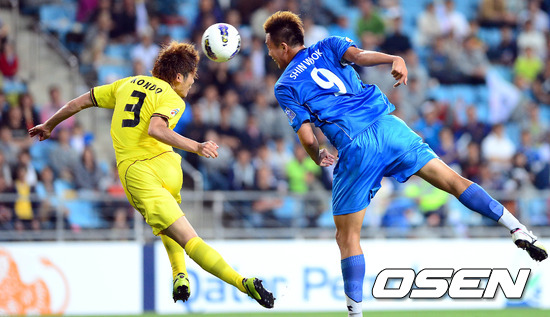 30일 오후 울산 문수축구경기장에서 열린 '2012 아시아축구연맹 챔피언스리그(ACL)' 16강전 울산 현대와 가시와 레이솔의 경기 후반 김신욱이 가시와 곤도와 공중볼 다툼을 하고 있다.