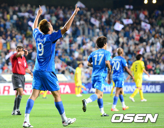 30일 오후 울산 문수축구경기장에서 열린 '2012 아시아축구연맹 챔피언스리그(ACL)' 16강전 울산 현대와 가시와 레이솔의 경기 후반 김신욱이 골을 넣은 후 손을 번쩍들며 기뻐하고 있다.