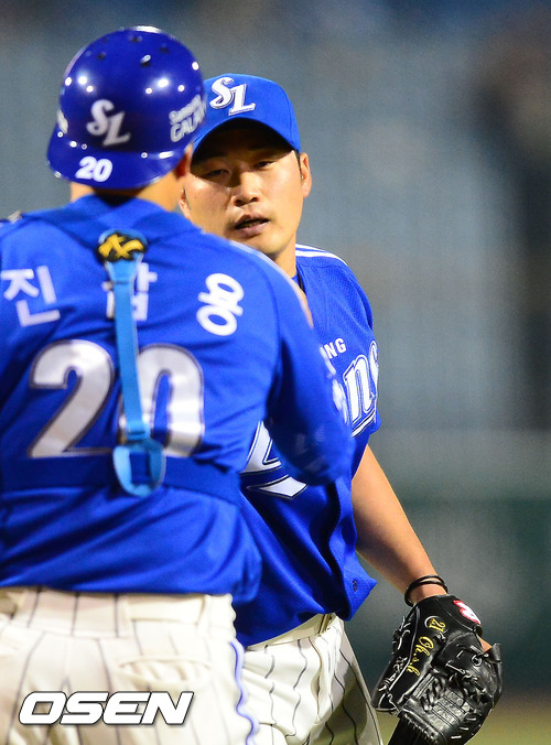 경기를 마치고 삼성 진갑용과 오승환이 하이파이브를 하고 있다. / rumi@osen.co.kr