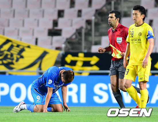 30일 오후 울산 문수축구경기장에서 열린 '2012 아시아축구연맹 챔피언스리그(ACL)' 16강전 울산 현대와 가시와 레이솔의 경기 종료 후 김신욱이 그라운드에 주저 앉고 있다.