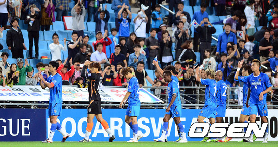30일 오후 울산 문수축구경기장에서 열린 '2012 아시아축구연맹 챔피언스리그(ACL)' 16강전 울산 현대와 가시와 레이솔의 경기 종료후 울산 선수들이 관중들에게 손을 흔들고 있다.