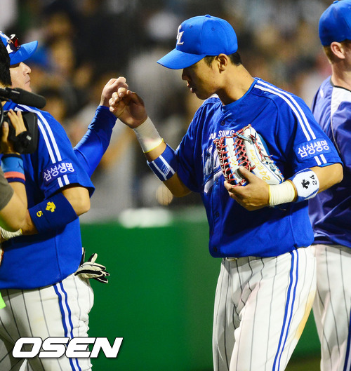 경기를 마치고 삼성 강봉규가 류중일 감독과 하이파이브를 하고 있다. / rumi@osen.co.kr