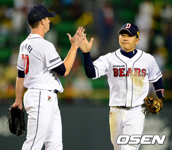 경기후 두산 프록터와 손시헌의 승리의 하이파이브를 하고 있다./jpnews@osen.co.kr