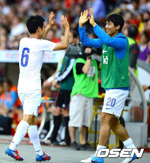 31일 새벽(한국시간) 스위스 수도 베른에 위치한 스타드 드 스위스서 열린 대한민국과 스페인의 평가전 전반 42분 김두현이 멋진 슈팅으로 동점골을 넣고 이동국과 하이파이브를 하고 있다.