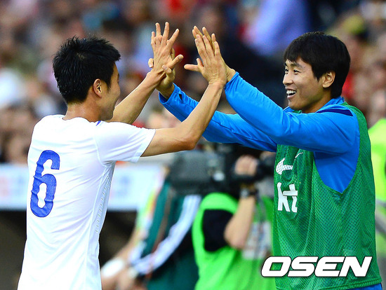 31일 새벽(한국시간) 스위스 수도 베른에 위치한 스타드 드 스위스서 열린 대한민국과 스페인의 평가전 전반 42분 김두현이 멋진 슈팅으로 동점골을 넣고 이동국과 하이파이브를 나누고 있다.