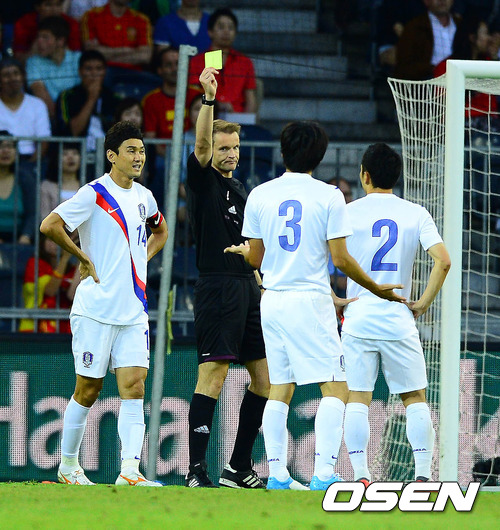 31일 새벽(한국시간) 스위스 수도 베른에 위치한 스타드 드 스위스서 열린 대한민국과 스페인의 평가전 후반 수비중 슈팅이 팔에 맞아 페널티킥이 선언되자 조용형이 주심에게 항의하고 있다.