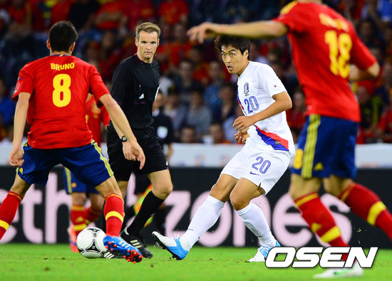 31일 새벽(한국시간) 스위스 수도 베른에 위치한 스타드 드 스위스서 열린 대한민국과 스페인의 평가전 후반 지동원과 교체되어 운동장을 밟은 이동국이 패스를 하고 있다.