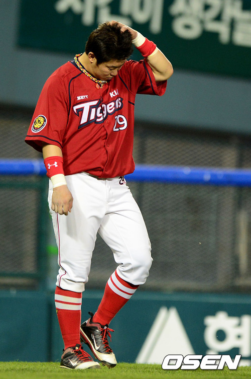 지난 5월 30일 잠실 두산전에서 1-4로 뒤진 9회초 2사 1, 3루에서 날린 홈런성 타구가 담장을 맞고 튀어나오는 바람에 동점에 실패한 나지완이 경기후 아쉬움을 표시하고 있다. /지형준 기자 jpnews@osen.co.kr