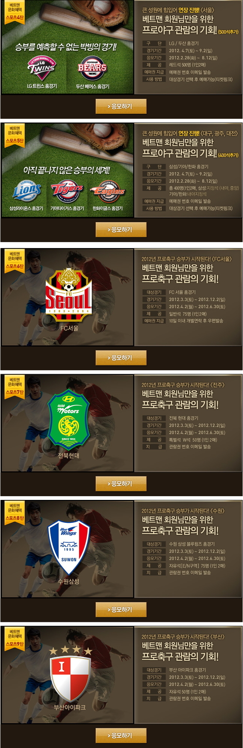 또 오늘 6월 30일까지 진행되는 베트맨 문화혜택 스포츠 ‘2012 프로축구 예매권 증정’ 이벤트도 함께 진행된다. 벳볼 100개 이상을 보유한 회원은 누구나 참여할 수 있으며, 당첨된 회원에게는 12월 2일까지 열리는 FC서울(일반석 75명), 전북현대(특별석 W석 50명), 수원삼성(자유석 E/N 구역 75명), 부산아이파크(자유석 50명)의 경기 중 자신이 응원하는 팀의 홈 경기를 관람할 수 있는 티켓(1인 2매)이 증정된다.