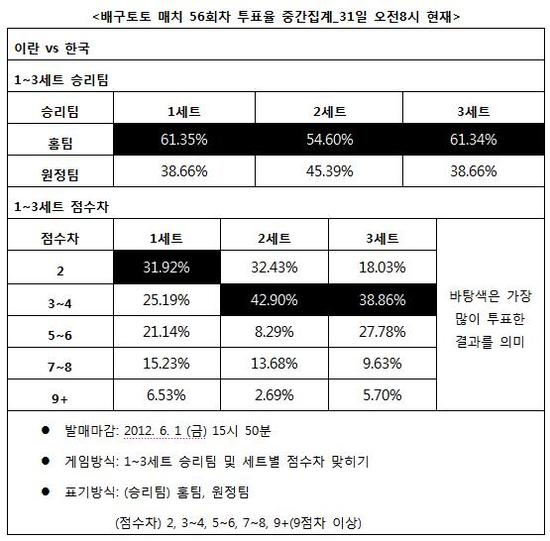 [배구토토] 국민체육진흥공단(www.kspo.or.kr)이 발행하는 체육진흥투표권 수탁사업자인 스포츠토토 공식 온라인 발매사이트 베트맨(www.betman.co.kr)이 내달 1일 오후 4시 일본 도쿄에서 열리는 2012 런던올림픽 남자배구 세계예선전 이란-한국전 대상 배구토토 매치 56회차 게임 투표율을 중간집계한 결과, 국내 배구팬들은 이란(세계랭킹 12위)이 한국(세계랭킹 20위)을 상대로 승리할 것으로 예상했다고 밝혔다.