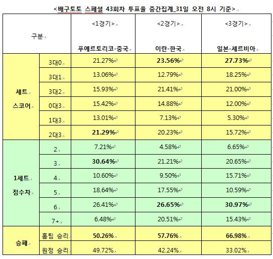 [배구토토] 국민체육진흥공단(www.kspo.or.kr)이 발행하는 체육진흥투표권 수탁사업자인 스포츠토토 공식 온라인 발매사이트 베트맨(www.betman.co.kr)이 내달 1일 열리는 2012 런던올림픽 남자배구 세계예선전 푸에르토리코-중국(1경기)전, 이란-한국(2경기)전, 일본-세르비아(3경기)전 등 총 3경기를 대상으로 한 배구토토 스페셜 43회차 게임 투표율 중간집계 결과 일본-세르비아전(3경기)에서 참가자의 66.98%는 홈팀 일본의 승리를 예상했다고 밝혔다.