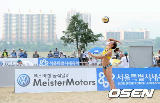 31일 서울 잠실 한강시민공원에서 열린 '2012 FIVB 세계여자비치발리볼 서울 챌린저 대회' 32강전, 독일 선수가 서브를 날리고 있다.