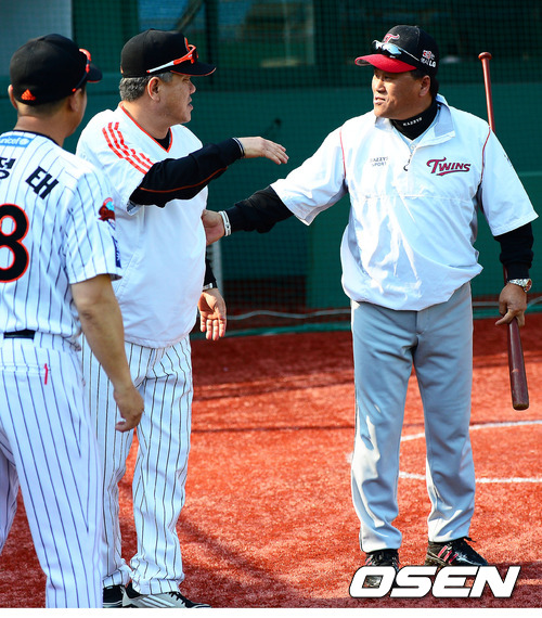 31일 오후 사직구장에서 '2012 팔도 프로야구' 롯데 자이언츠와 LG 트윈스의 경기가 열릴 예정인 가운데 양팀 훈련시간에 롯데 양승호 감독과 LG 김무관 코치가 악수를 나눈 후 즐겁게 얘기를 하고 있다.