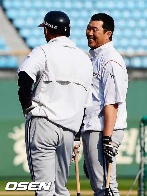 31일 오후 사직구장에서 '2012 팔도 프로야구' 롯데 자이언츠와 LG 트윈스의 경기가 열릴 예정인 가운데 양팀 훈련시간에 LG 최동수와 이병규가 즐겁게 얘기를 나누고 있다.