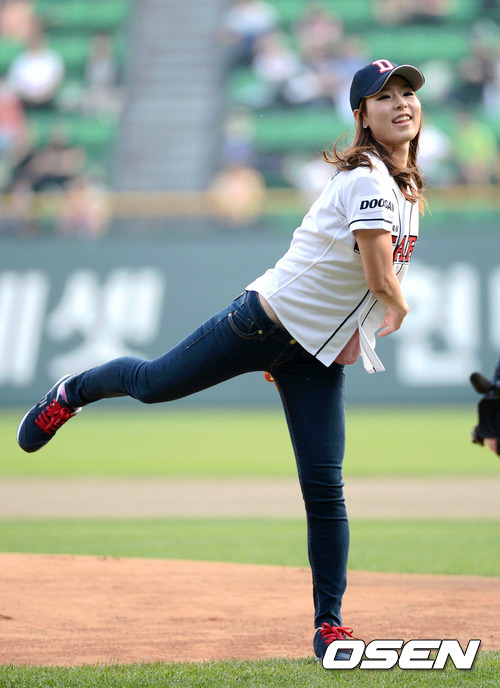 31일 오후 서울 잠실야구장에서 열린 '2012 팔도 프로야구' 두산 베어스와 KIA 타이거즈의 경기에 앞서 미녀 골프 선수 김자영이 시구를 하고 있다.
