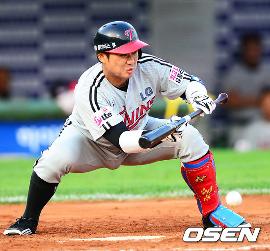 31일 오후 사직구장에서 열린 '2012 팔도 프로야구' 롯데 자이언츠와 LG 트윈스의 경기에서 3회초 무사 주자 2루 LG 김태군이 희생번트에 성공하고 있다.