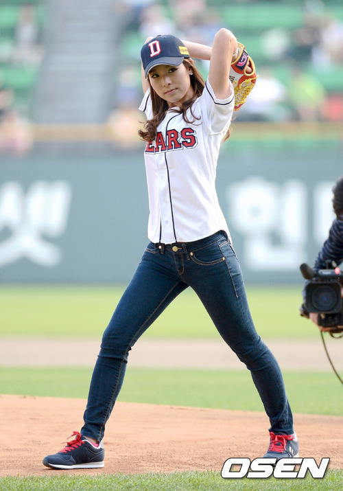 31일 오후 서울 잠실야구장에서 열린 '2012 팔도 프로야구' 두산 베어스와 KIA 타이거즈의 경기에 앞서 미녀 골프 선수 김자영이 시구를 하고 있다.