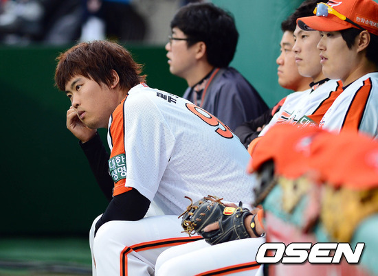 31일 오후 대전 한밭구장에서 열린 '2012 팔도 프로야구' 한화 이글스와 삼성 라이온즈의 경기 1회말 류현진이 덕아웃에서 경기를 지켜보고 있다.