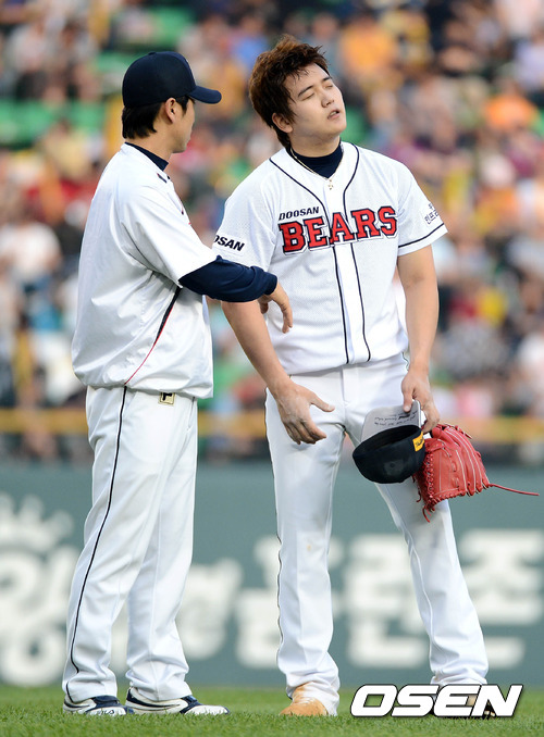 타구가 그대로 오른 팔꿈치를 직격했고 결국 마운드를 내려왔다. 두산 베어스 우완 선발 임태훈(24)이 1⅓이닝 2실점을 기록한 채 팔꿈치 직격타로 조기 강판했다.