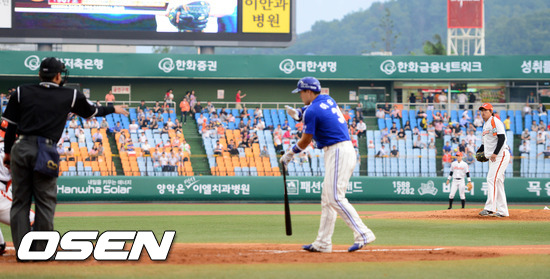 31일 오후 대전 한밭구장에서 열린 '2012 팔도 프로야구' 한화 이글스와 삼성 라이온즈의 경기 2회초 선두타자 이승엽이 류현진에 헛스윙 삼진아웃되고 있다.