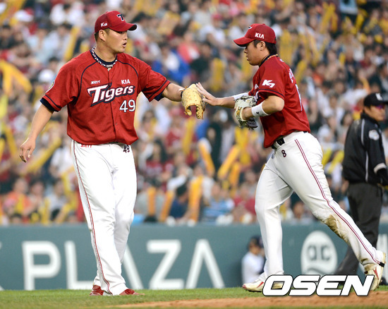 31일 오후 서울 잠실야구장에서 열린 '2012 팔도 프로야구' 두산 베어스와 KIA 타이거즈의 경기, 2회말 2사 1루 KIA 김진우가 두산 정수빈을 땅볼 아웃으로 처리하고 안치홍과 하이파이브를 하고 있다.