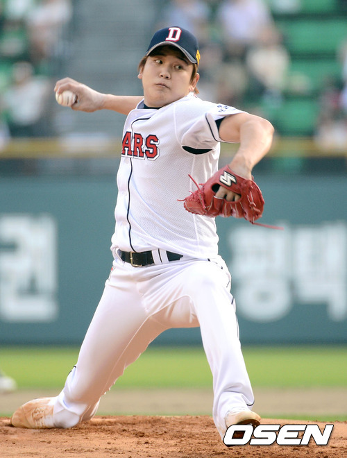 31일 오후 서울 잠실야구장에서 열린 '2012 팔도 프로야구' 두산 베어스와 KIA 타이거즈의 경기, 1회초 두산 선발 투수 임태훈이 힘차게 공을 던지고 있다.