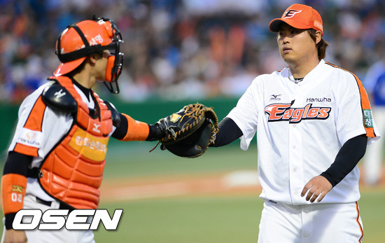 31일 오후 대전 한밭구장에서 열린 '2012 팔도 프로야구' 한화 이글스와 삼성 라이온즈의 경기 4회초를 마친 류현진이 덕아웃으로 향하며 정범모와 하이파이브를 하고 있다.