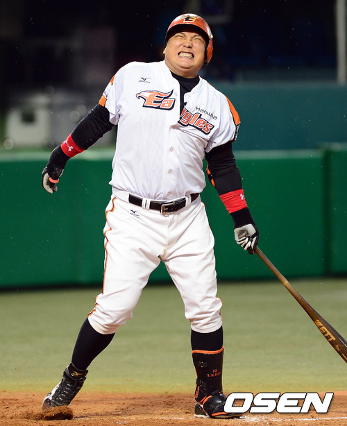 31일 오후 대전 한밭구장에서 열린 '2012 팔도 프로야구' 한화 이글스와 삼성 라이온즈의 경기 4회말 1사 2루 김태균이 배영수의 공에 몸을 맞고 고통스러운 표정을 짓고 있다.