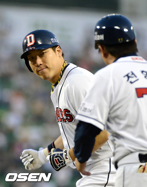 31일 오후 서울 잠실야구장에서 열린 '2012 팔도 프로야구' 두산 베어스와 KIA 타이거즈의 경기, 3회말 1사 1,3루 두산 김현수가 중전 1타점 적시타를 치고 환호하고 있다.