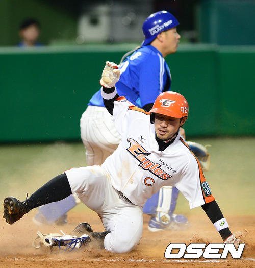 31일 오후 대전 한밭구장에서 열린 '2012 팔도 프로야구' 한화 이글스와 삼성 라이온즈의 경기 4회말 1사 1,2루 최진행의 1타점 적시타에 2루주자 한상훈이 홈에서 세이프되고 있다.