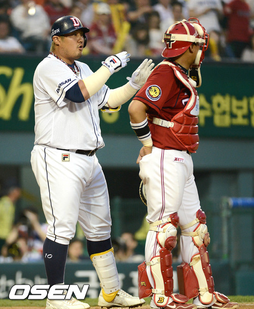 31일 오후 서울 잠실야구장에서 열린 '2012 팔도 프로야구' 두산 베어스와 KIA 타이거즈의 경기, 3회말 1사 1,2루 두산 최준석이 담장을 넘긴 타구가 파울로 선언되자 아쉬워하고 있다.