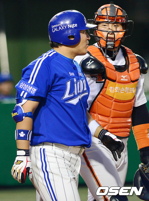 31일 오후 대전 한밭구장에서 열린 '2012 팔도 프로야구' 한화 이글스와 삼성 라이온즈의 경기 5회초 최형우가 공에 몸을 맞자 류현진을 쳐다보고 있다.