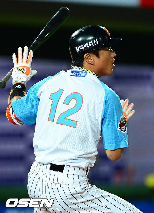 31일 오후 사직구장에서 열린 '2012 팔도 프로야구' 롯데 자이언츠와 LG 트윈스의 경기에서 6회말 1사 주자 3루 롯데 김주찬이 중견수 뒤 1타점 2루타를 날리고 있다.