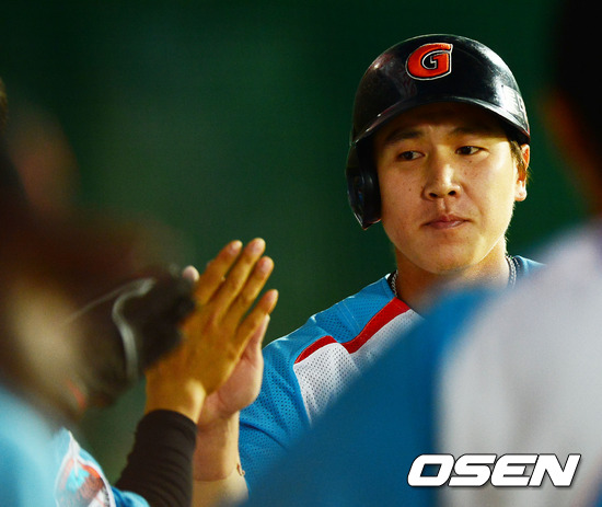 31일 오후 사직구장에서 열린 '2012 팔도 프로야구' 롯데 자이언츠와 LG 트윈스의 경기에서 6회말 1사 주자 3루 롯데 김주찬의 중견수 뒤 1타점 2루타때 홈을 밟은 박준서가 덕아웃에서 동료들과 하이파이브를 하고 있다.