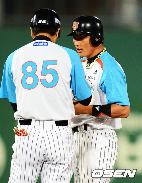 31일 오후 사직구장에서 열린 '2012 팔도 프로야구' 롯데 자이언츠와 LG 트윈스의 경기에서 6회말 1사 주자 3루 롯데 김주찬이 중견수 뒤 1타점 2루타를 날린 후 2루에서 박계원 코치와 하이파이브를 하고 있다.