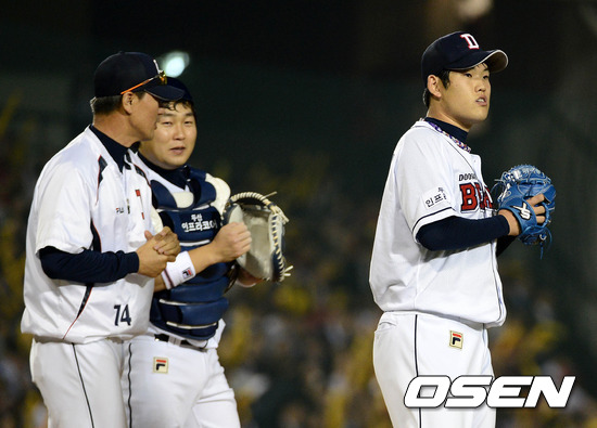 31일 오후 서울 잠실야구장에서 열린 '2012 팔도 프로야구' 두산 베어스와 KIA 타이거즈의 경기, 5회초 1사 1루 KIA 안치홍 타석때 두산 정대현이 마운드를 내려가고 있다.