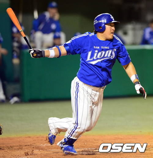 31일 오후 대전 한밭구장에서 열린 '2012 팔도 프로야구' 한화 이글스와 삼성 라이온즈의 경기 7회초 선두타자 최형우가 우익수 오른쪽 1루타를 치고 있다.