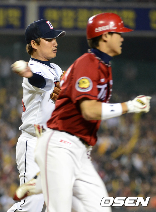 31일 오후 서울 잠실야구장에서 열린 '2012 팔도 프로야구' 두산 베어스와 KIA 타이거즈의 경기, 6회초 무사 1루 두산 정재훈이 KIA 이준호의 땅볼 타구를 잡아 1루로 송구하고 있다.